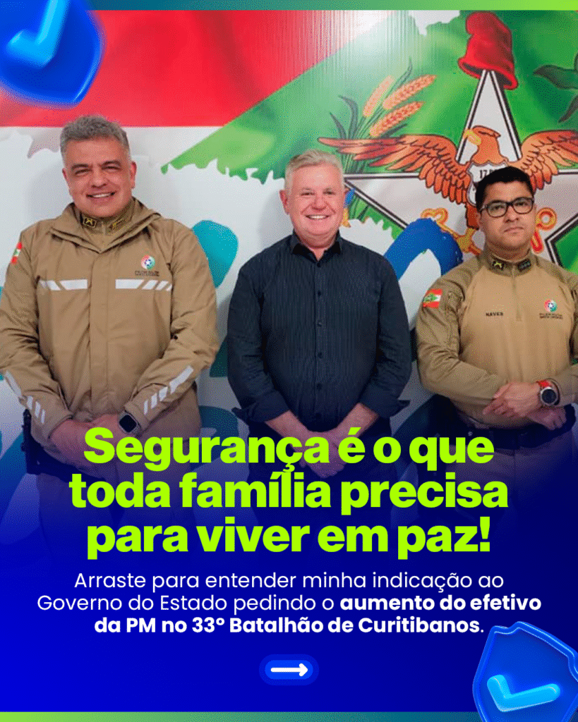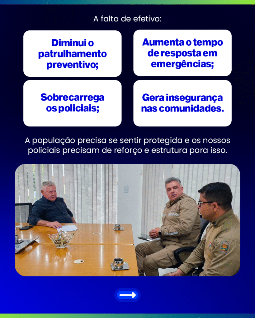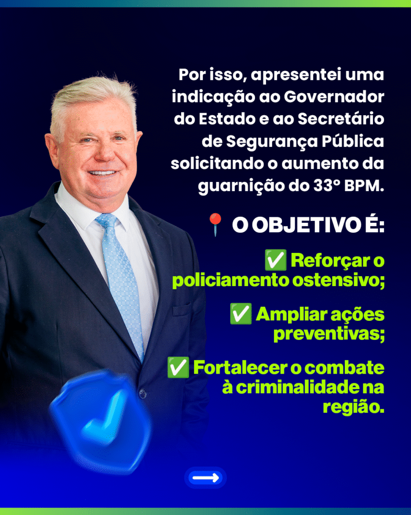 Diante disso, o parlamentar apresentou uma indicação ao Governo do Estado e à Secretaria de Segurança Pública, solicitando o aumento do efetivo, com o objetivo de reforçar o policiamento ostensivo, ampliar ações preventivas e fortalecer o combate à criminalidade.
