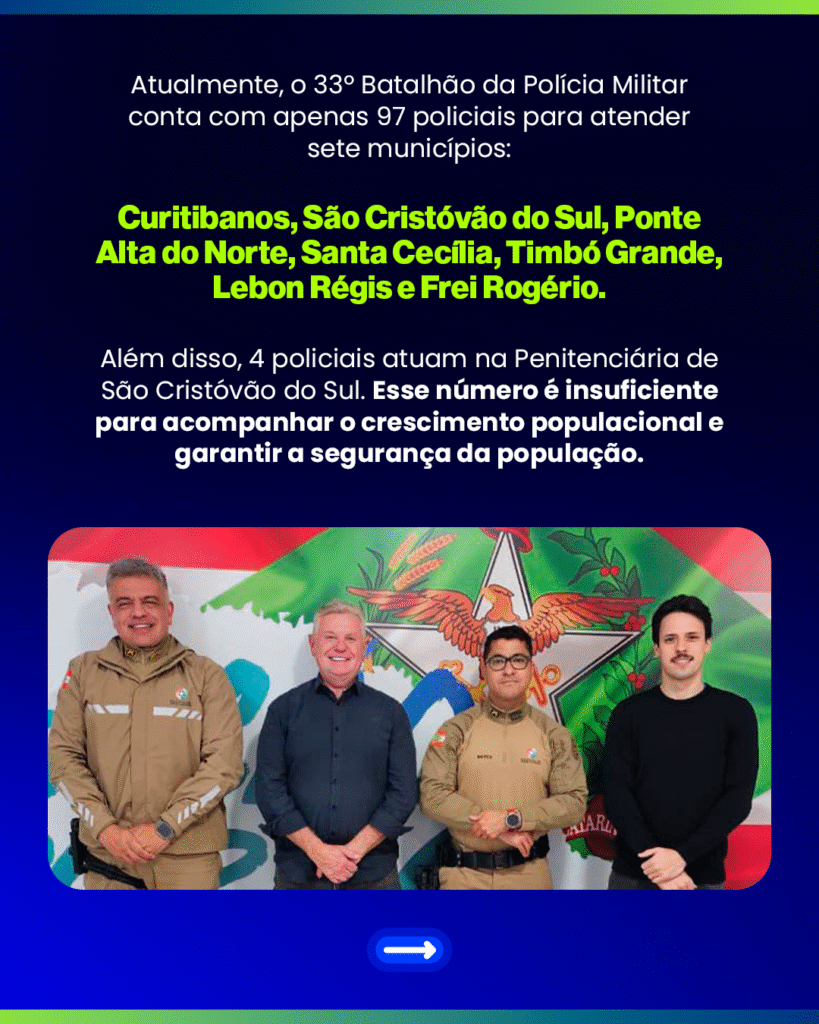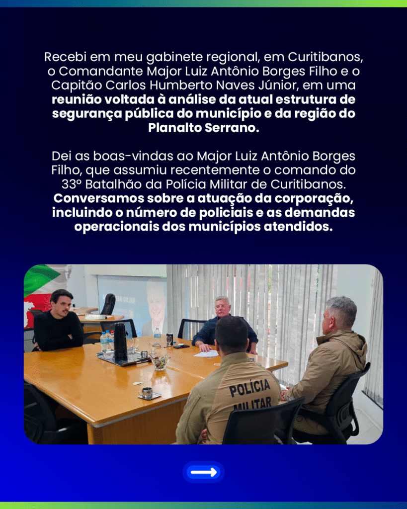 Recebi em seu gabinete regional, em Curitibanos, o Comandante Major Luiz Antônio Borges Filho e o Capitão Carlos Humberto Naves Júnior, em reunião para discutir a estrutura atual da segurança pública da região do Planalto Serrano.